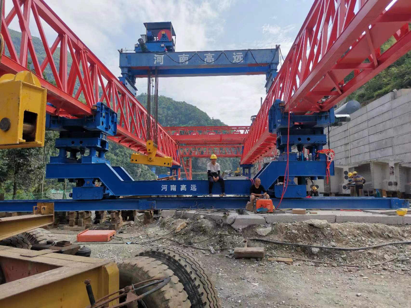 架橋機(jī)主要由主梁、懸臂梁、下導(dǎo)梁、前后支腿、輔支腿、吊梁行車、懸臂吊及電液系統(tǒng)組成。適用于三種不同跨徑單跨簡支梁的架設(shè),作業(yè)效率高。本類型架橋機(jī)能夠架設(shè)直線、曲線、縱坡的等跨及變跨雙線預(yù)應(yīng)力混凝土整孔箱梁。該 架橋機(jī)除了能夠進(jìn)行標(biāo)準(zhǔn)架設(shè)作業(yè)外,還能滿足首末跨架設(shè)、曲線架設(shè)、變跨架設(shè)、跨連續(xù)梁、結(jié)合梁、連續(xù)鋼構(gòu)等。既有橋梁架設(shè)、簡支變跨連續(xù)架設(shè)等工況施工。具有簡支架設(shè)、定點(diǎn)起吊、梁體吊裝穩(wěn)定性好、作業(yè)效率高、安全可靠、變跨調(diào)整方便、操作方便等特點(diǎn)。